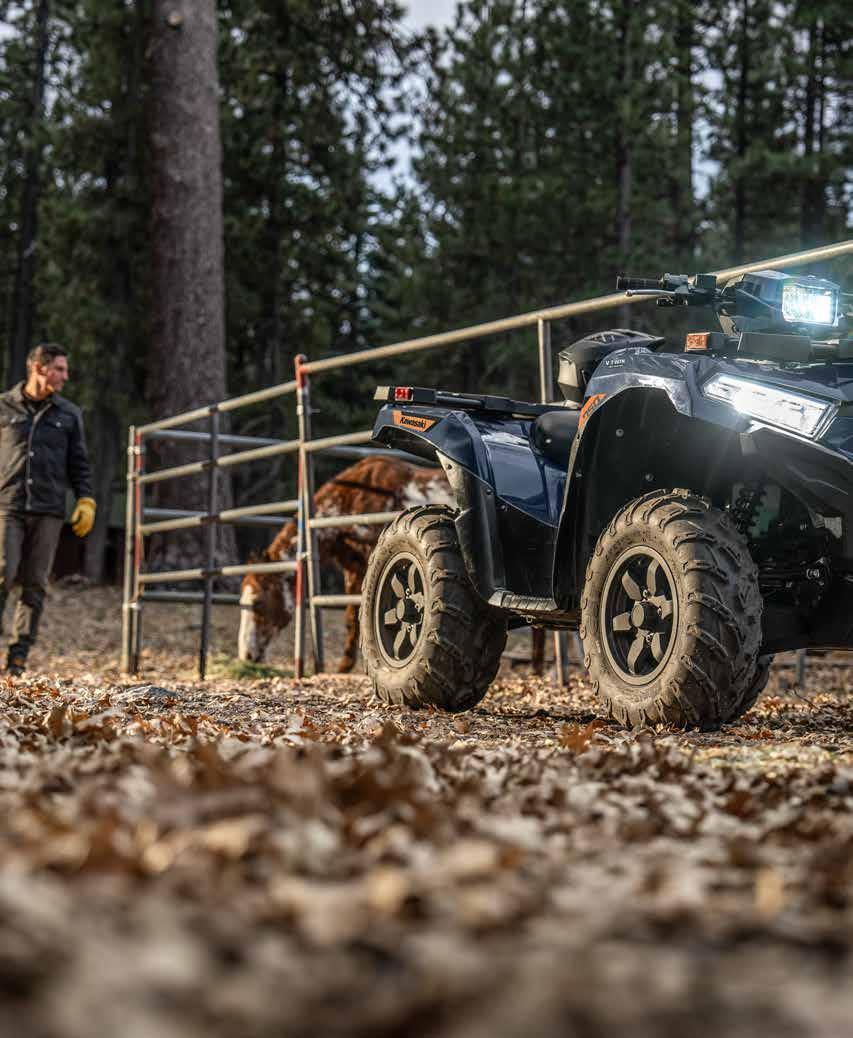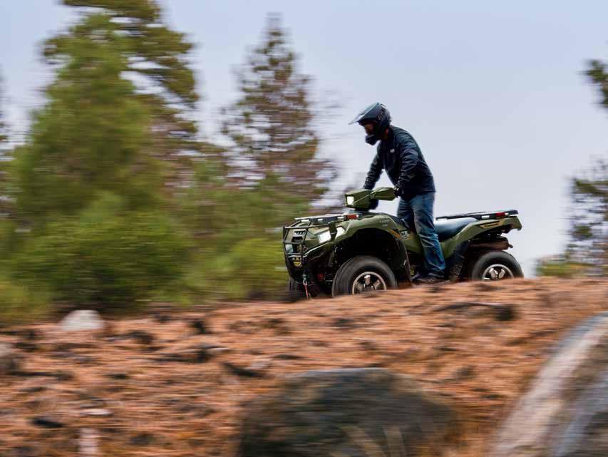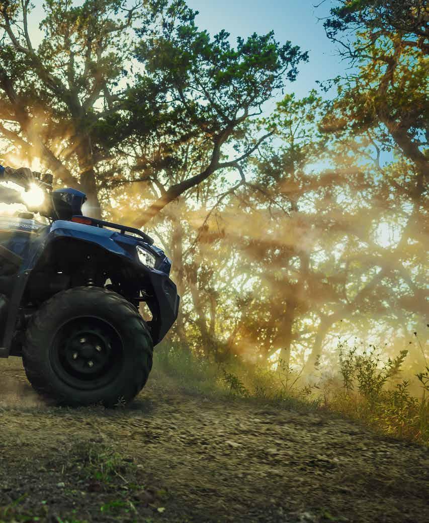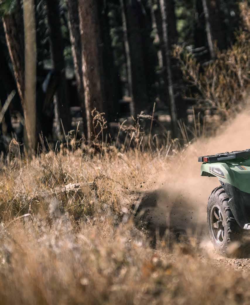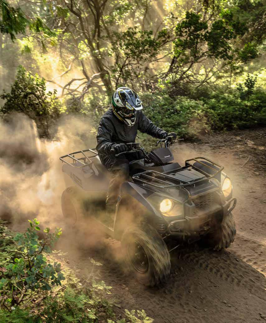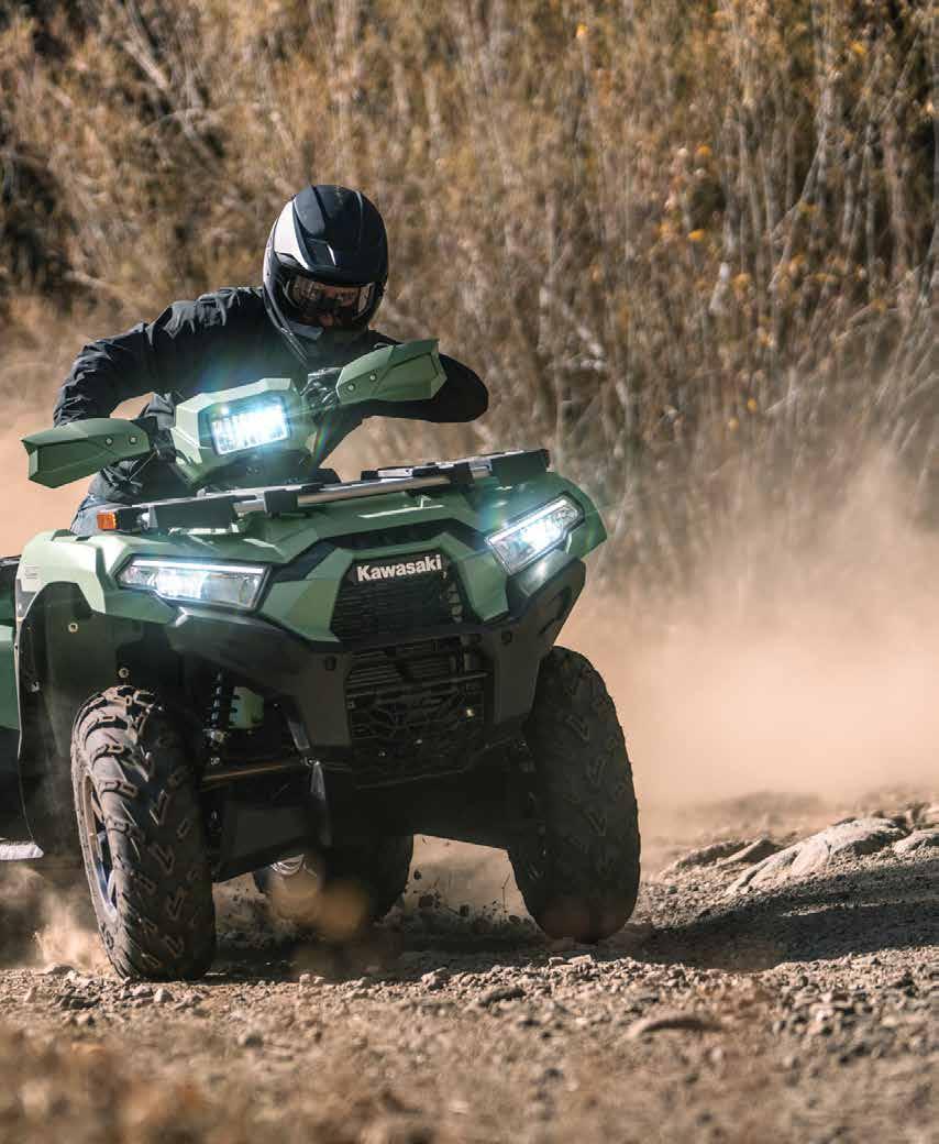 KAWASAKI CARES: Read Owner’s Manual and all on-product warnings. Warning: ATVs can be hazardous to operate. For your safety: Always wear a helmet, eye protection, and protective clothing. Never carry a passenger. Never ride under the influence of drugs or alcohol. Never ride on public roads or pavement. Avoid excessive speeds and stunt driving. Be extra careful on difficult terrain. Kawasaki ATVs with engines over 90cc are recommended for use only by persons 16 years of age or older. Kawasaki also recommends that all ATV riders take a training course. For more information, see your dealer, call the ATV Safety Institute at 1-800-887-2887, or go to www.atvsafety.org. ©2016 Kawasaki Motors Corp., U.S.A.