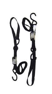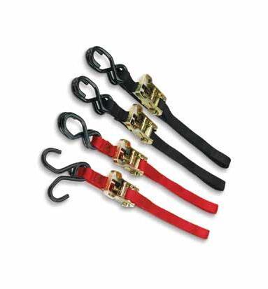 Ancra’s latest heavy duty tie-downs feature 38mm (1.5”) 6,000 lbs. abrasion resistant webbing • Heavy duty hooks, buckles and ratchets • Ratchet style offers a unique gradual release feature with big, comfortable, easy-to-use handles and latches • Offered in four styles: standard cam buckle, cam buckle with built in soft tie (Integra), gradual-release ratchet buckle and gradual-release ratchet buckle with built in soft tie (Integra) • Sold as a set of 2 Integra Ratchet Buckle, Big Bike Tie-Down Set, Black
