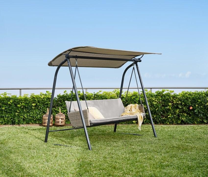 Bord: Aluminium og fibersement. B70 x L110 x H42 cm. 3-seters sofa og stol: Aluminium og petan. Inkl. eksklusive puter med hurtigtørkende, strukturvevd trekk. Vanntett coating på innsiden av trekket hindrer vann i å trenge inn i puten. Stol: B74 x H75 x D77 cm, setehøyde: 33 cm. Sofa: B170 x H75 x D77 cm, setehøyde: 33 cm.