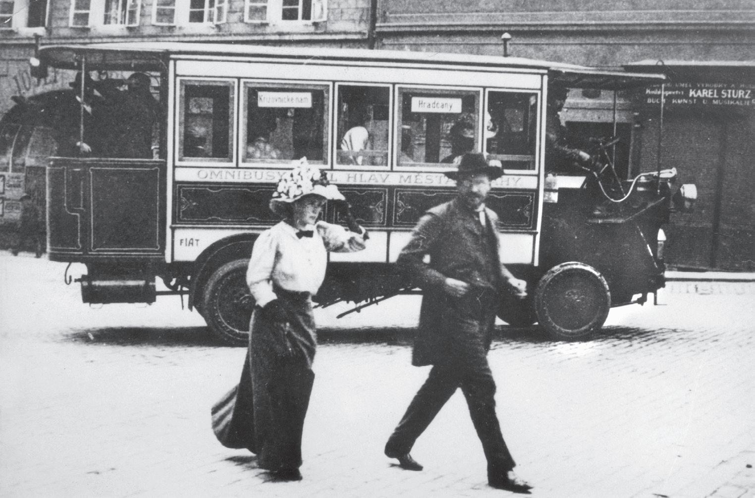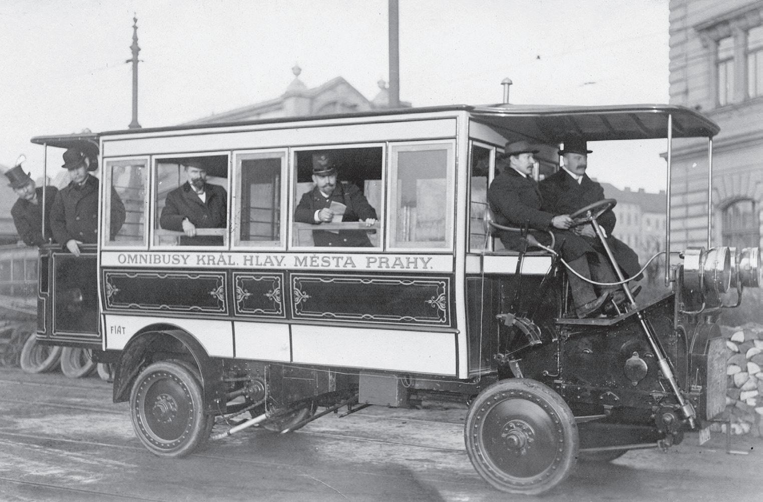 Italský autobus Fiat na křižovnickém náměstí okolo roku 1908. Původní trasa první městské autobusové linky vedla z Malostranského náměstí na Pohořelec a dosahovala délky 1,6 km. Pražské autobusy jezdily z Malostranského náměstí přes starobylý k arlův most od 1. května 1908 do 7. září 1909, a tak celková délka trasy dosáhla 2,268 km.