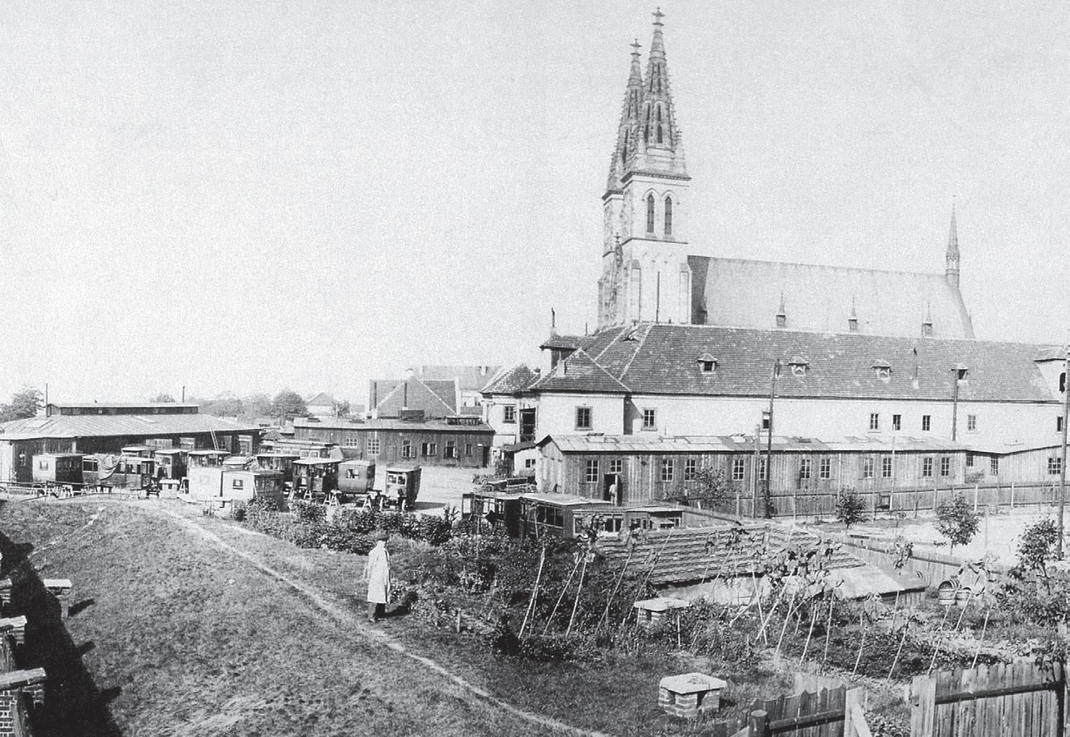 Foto neznámý autor, ADP V místě dnešních Vyšehradských sadů stávaly ve dvacátých letech první samostatné garáže autobusové dopravy provozované Československou poštovní veřejnou silniční dopravou. Objekt z roku 1655 nesl název Citadela a od podzimu 1920 byl využíván pro silniční dopravu. Většina budov byla dřevěná a počátkem roku 1927 při požáru lehla popelem, včetně několika autobusů. snímek pochází z období let 1920 až 1927.