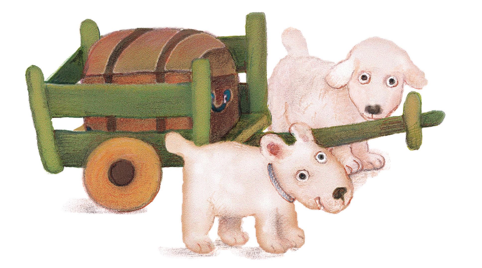 „Vidíš, nebyla jsi vlese sama,“ řekl staříček. Pak zapískal na píšťalku. Na to zapískání přiběhli dva psíčci smalým vozíčkem. Byla na něm truhlička.