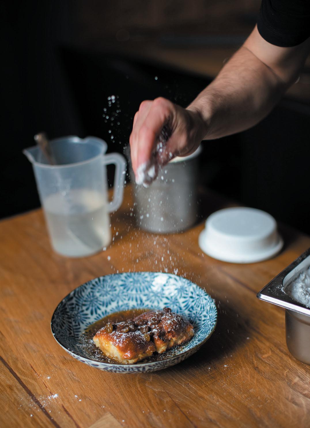 Z cukru na pánvi vytvoříme karamel, přilijeme rum a necháme odpařit alkohol. Osolíme, přidáme rozinky a vmícháme studené máslo, aby vznikla hustá omáčka.