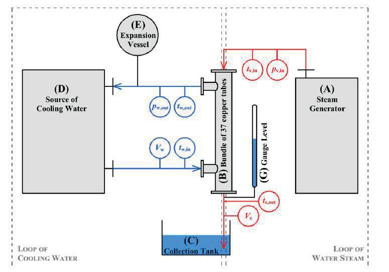 For investigating parameters affecting the effects of heat transfer and fluid flow, an experimental measuring line was set up to model the operating conditions during the condensation of water vapour in the tube bundle of a heat exchanger with wavy micro-channels. For the experimental investigation of the effects required parameters, the ideological design of the measuring line was initially performed, the main evaluated element, of which, was the tube heat exchanger with wavy micro-channels. The actual measuring line was set up on the basis of agreed design and technical documentation in the operating premises of the steam source and cooling water suppliers. The experimental setup for the description is divided into a water vapour circuit and cooling water circuit, see Figure 1. The water vapour circuit consists of a tank/source (A) where vapour is produced with a known temperature tv,in (°C) and pressure pv,in (Pa). The water vapour enters to the measured bundle of 55 copper thin-walled tubes (B), where it becomes to the condensation process. The condensate volume flow Vc (m3/s) and of condensate temperature tc,out (°C) is measured on the outlet of the tube bundle wavy micro-channels before flowing into the tank (C). The internal distance between tubes in the bundle is cooled by a circuit from a source of cold water (D). Volume changes of the cooling water are compensated by the expansion tank (E). On the vapour condensate at level H(m) of standard a bundle of wavy micro-channels is shown the outer gauge on level (G). The tube casing of the exchanger is insulated by thermal insulation with a thickness of 10 cm, so the heat transfer is not affected and it doesn’t lead to heat loss. The inner surface of the measuring wavy micro-channels is cleaned with a high percentage of alcohol cleaner and the purity of the water vapour from the steam generator is over 99.9 %. The object of experimental monitoring of the tube vapour/water heat exchanger was measured in a vertical position in combination with counterflow and parallel flow connection of cooling water. Besides that, changing the method of connection of the exchanger as counterflow/parallel flow parametric changes of input liquid were exercised, i. e. on the side of input vapour and on the side of input cooling water. The side of vapour: One variable parameter on the water vapour side was in the form of a change of the pressure of the saturated water vapour at the inlet of the exchanger and there is a synergistically associated change in the mass flow of water vapour in the exchanger. The range of pressure change was from 0.10 barg (heat water approx. 100 °C) to 3.20 barg (saturated vapour approx. 138 °C). The pressure of inlet saturated vapour was measured by temperature, independently on two places with the sensitivity of the thermocouple ± 0.10 K.