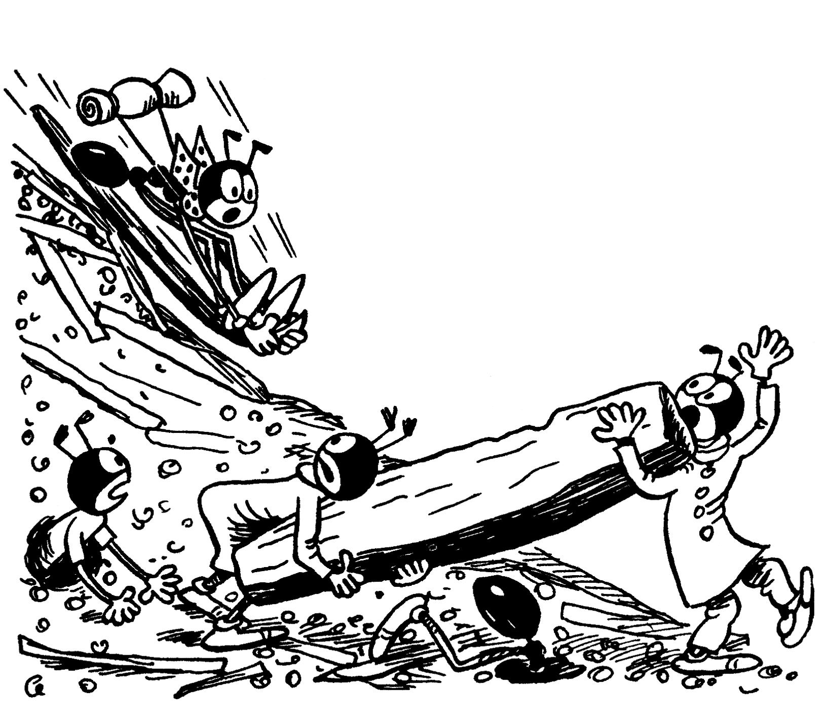 jako na sáňkách. A jak tak jel dolů, nevyhnuli se mu uprostřed cesty nějací tesaři, kteří nesli do mraveniště trám. vrazil do nich, trám spadl, tesaři také. Ale čipera mravenec si z toho nic nedělal, vyskočil honem zase na jehličí a „vúúúú!“, dojel na svých podivných sáňkách až dolů. panečku, a jak přitom vytáčel zatáčky!