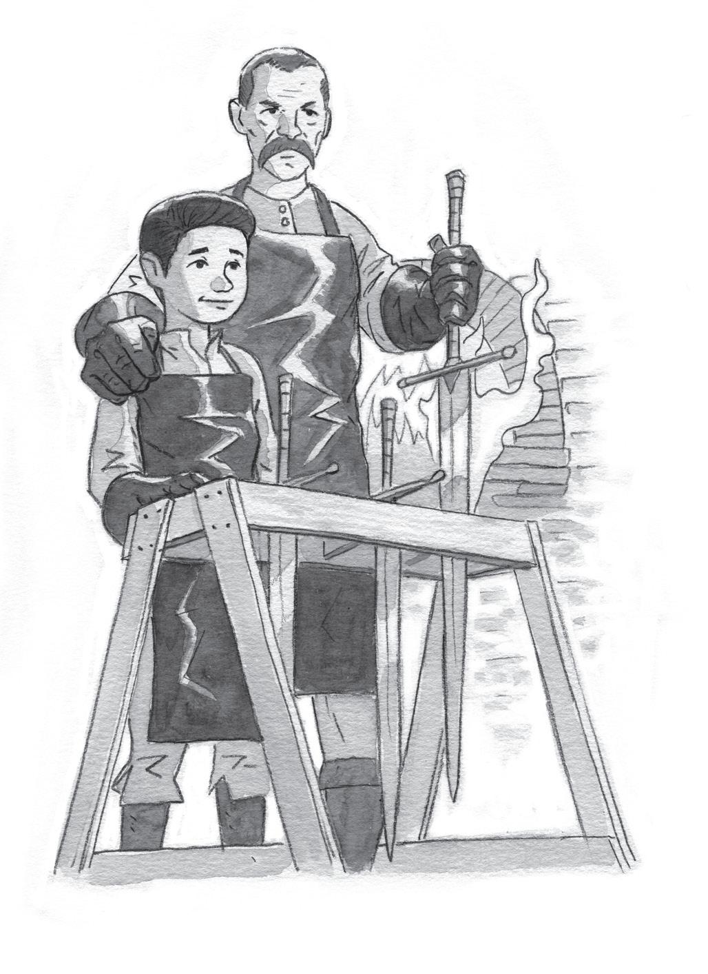 Tom se zakřenil. Tváře měl horké a paže ho bolely, ale v kovárně pomáhal moc rád. Miloval práci u výhně a to, jak táta dokázal z kusů šeredného kovu vytvořit nářadí, podkovy i čepele. Teď se táta zadíval na stojan s osmi připravenými meči a spokojeně přikývl.