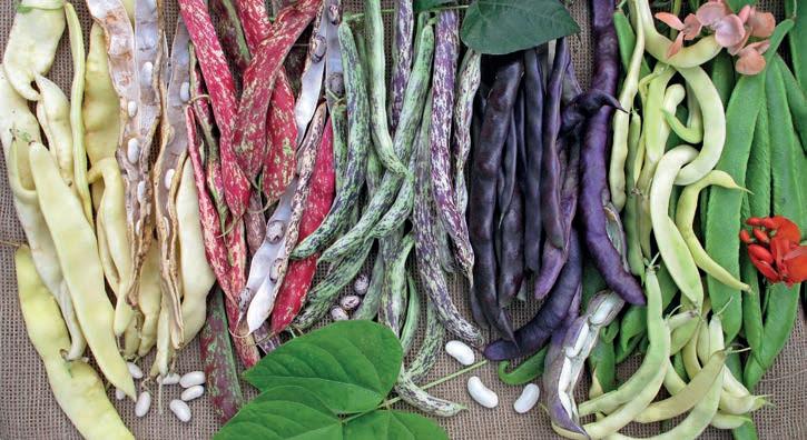 Různorodost odrůd u fazolí (zleva doprava): 'Italian Gold', 'Borlotto', 'Violet Podded', 'Anellino Giallo', 'Sunset' a 'Ladi Di'