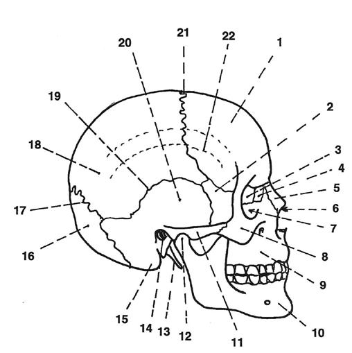 1 – kost čelní, 2 – velké křídlo kosti klínové, 3 – kost čichová, 4 – kost slzní, 5 – kost nosní, 6 – vchod do dutiny nosní, 7 – očnicový vchod, 8 – kost lícní, 9 – hodní čelist, 10 – dolní čelist (bradový výběžek), 11 – jařmový oblouk, 12 – hlavička dolní čelisti, 13 – styloidní výběžek kosti spánkové, 14 – zevní zvukovod, 15 – bradavkovitý výběžek kosti spánkové, 16 – kost týlní, 17 – lambdový šev, 18 – kost temenní, 19 – šupinový šev, 20 – šupina kosti spánkové, 21 – věncový šev, 22 – dolní temporální čára (začátek m. temporalis)