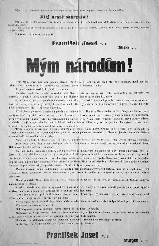 Nastala neděle 26. července 1914. Ještě v noci otvírali velitelé regimentů a batalionů císařské armády, rakouské zeměbrany a uherského královského vojska zapečetěné obálky s instrukcemi pro případ mobilizace. Na veřejných prostranstvích i na úředních budovách vylepili v brzkém ránu zřízenci mobilizační vyhlášky: „Jdu-li dnes po letech kolem místa, kde jsem u pošty četl onu černožlutou vyhlášku, vždy znovu a znovu oživí se ona vzpomínka na smutné jitro 26. července 1914,“ vzpomínal Antonín Černý z Domažlic. „Vidím vždy jasně hlouček chodských žen, několik mužů, kteří ustrašení zde stáli a slabikovali. Na první pohled poznal jsi, koho se to týkalo. Vojáci – a mezi ně patřil jsem i já, nešťastník – a ženy, které měly syna vojákem neb muže vojína, stáli němě, a věřím pevně, že četli každou řádku nejméně dvakráte. Jednak nechápali naráz smysl, jednak oči chvílemi neviděly, jen bloudily po žlutém papíře. A nikdo z postižených nemluvil. – Vždyť hrdlo bylo staženo a v hlavě hučelo a praskalo. Do 48 hodin!“ Noviny se snažily uklidňovat obecné mínění. Ještě 1. srpna ubezpečovala Národní politika, že mobilizace ještě neznamená válku. „Mobilisovati značí doslovně učiniti mobilním, připraveným, pohyblivým. Je dojista nejen právem, ale i povinností mecenášů zabezpečiti říši takovým opatřením vůči všemožným událostem. […] Mobilisace neznamená válku, mobilisace může býti každé chvíle zase zrušena, když odpadne příčina, pro kterou byla nařízena.“ Podobně hovořil rakousko-uherský ministr zahraničí, který dobře věděl o zprostředkovatelských návrzích britského ministra zahraničí Edwarda Greye. Britům se do války nechtělo a po odplatě za rok 1871