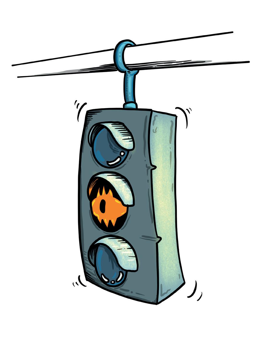„To je vážné, musíme zavolat na pomoc jiné semafory,“ mudroval zelený panáček ze semaforu pro chodce, který stál hned vedle. „Máš pravdu, ještě nikdy se nestalo, aby náš Zelenka přestal měnit barvy. Neoddychl si snad ani v noci,“ přitakal mu červený kolega. Oba měli teď pauzu. Chodci mohli křižovatkou procházet volně, auta stála.