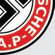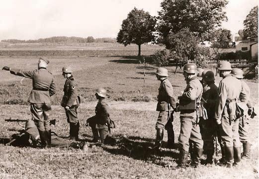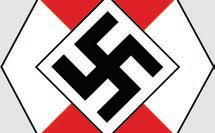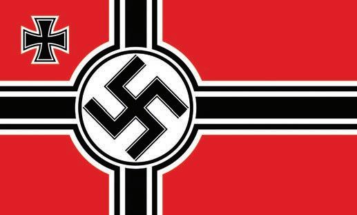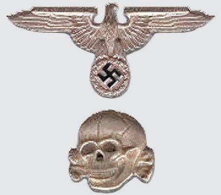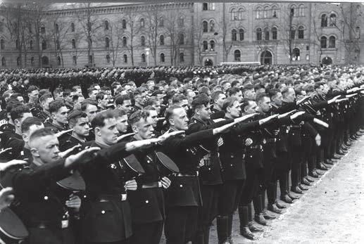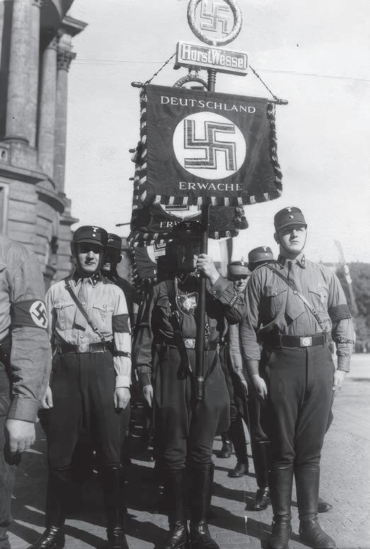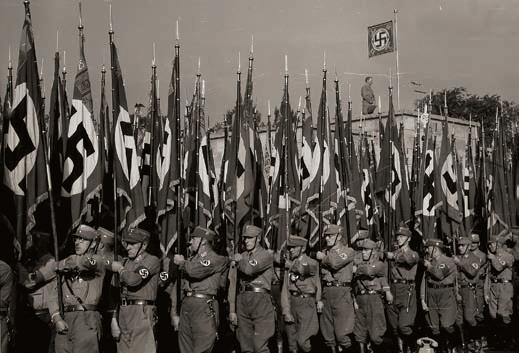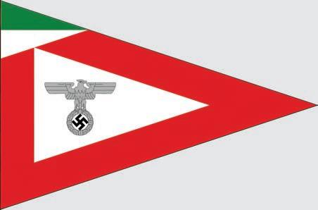Ochranného oddílu (Schutzstaffel, SS) v typických černých uniformách. Po roce 1933 se jejich organizace značně rozšířila a stala se pověstným státem ve státě s vlastními řády, rituály, školami, a dokonce i soudnictvím. Hitler pověřil Himmlera vybudováním SS jako přísně výběrové organizace fanatických stoupenců nacismu a jako nejúčinnějšího nástroje jeho budoucí rasistické politiky. Vlajka SS.