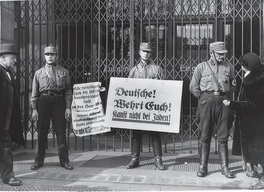 „Němci! Braňte se! Nenakupujte u Židů!“ Hlídka SA před jedním z berlínských obchodů v době bojkotu na konci března 1933.