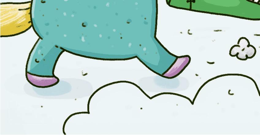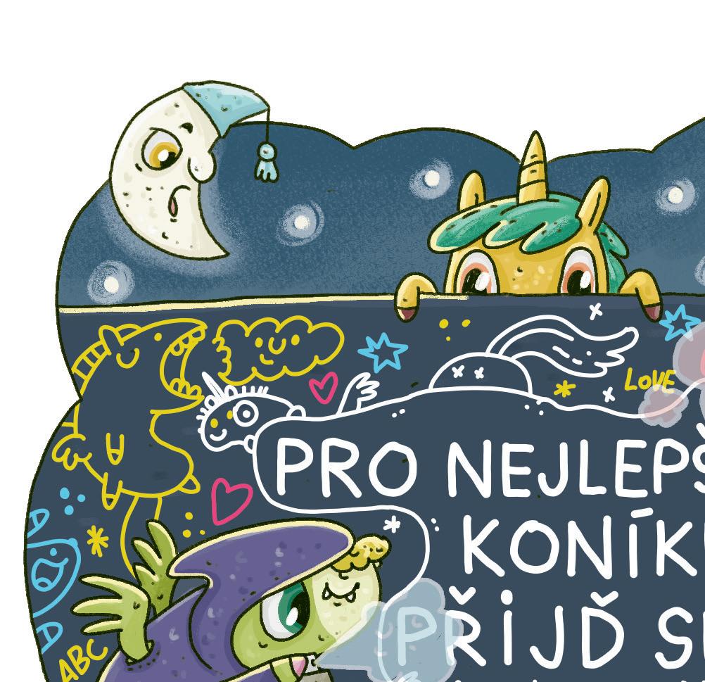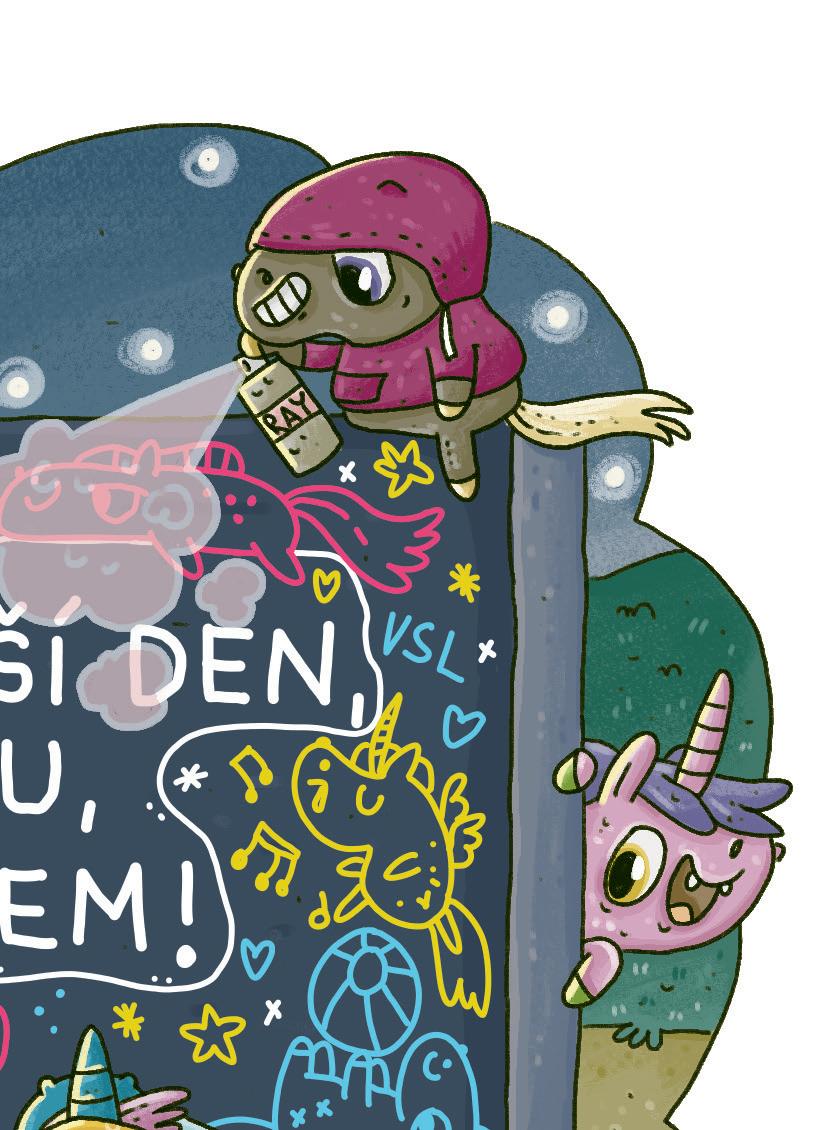 „Ano, to je dokonalé! A k tomu ještě nakreslíme parádní obrázek,“ volali koníci. Jak padla večerní tma, vyrazili do parku v mikinách s kapucí, aby byli nenápadní. V kopýtkách měli spreje a křídy. Ráno byste zeď u hřiště vůbec nepoznali! Bylo