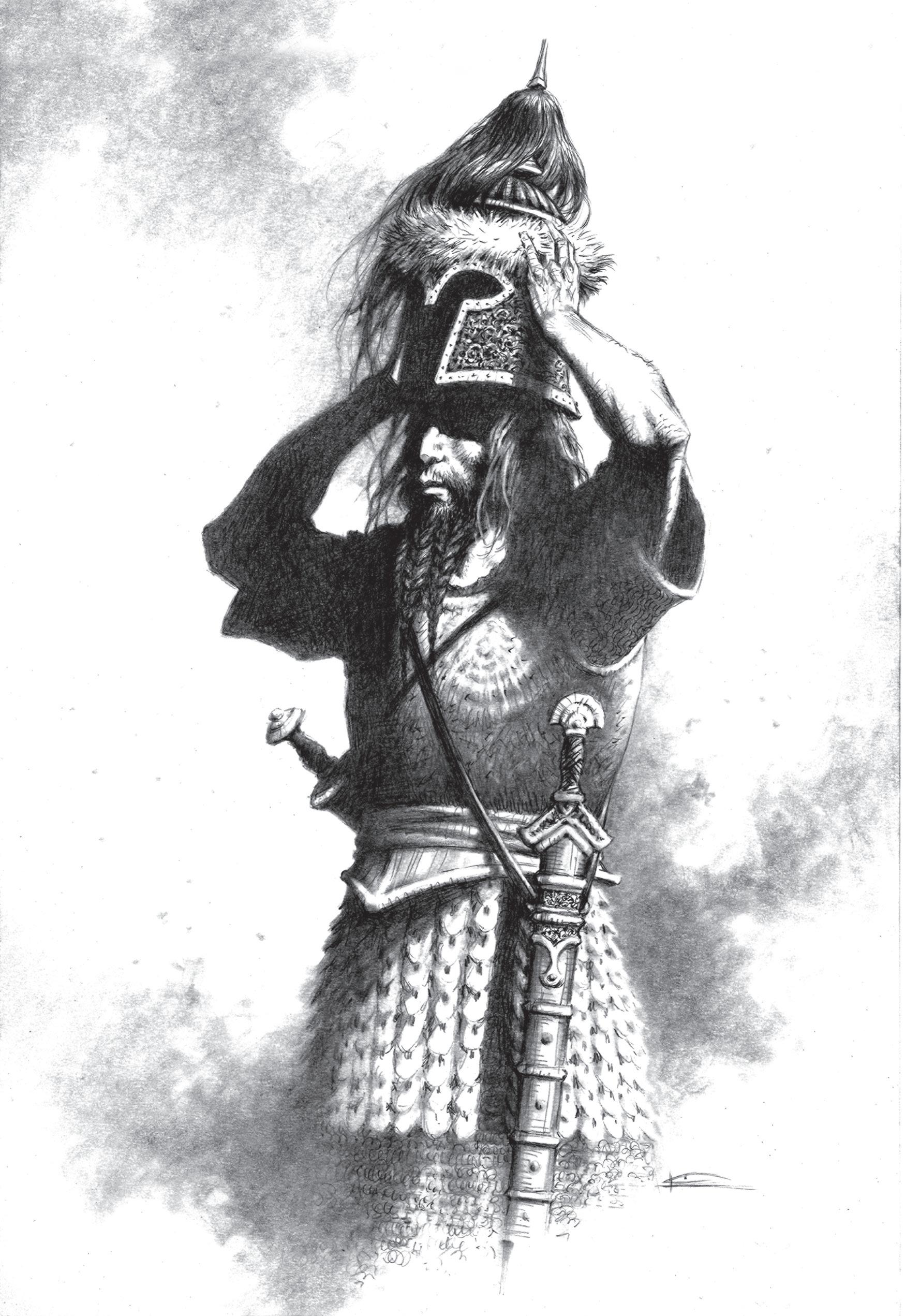 Pod ním měl černý kyrys a meč v pochvě. Ze země u trůnu zvedl válečnou přilbu z černé oceli lemovanou kožešinou ze stříbrné lišky a nasadil si ji na hlavu. Otřel si zkrvavená ústa do drenajského roucha a bezstarostně jej pohodil směrem k Bartellovi.