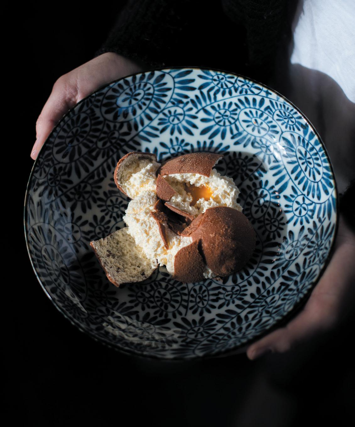 Aby bylo vejce na povrchu pěkně čokoládové, můžete dát rozehřátou čokoládu do cukrářské pistole a nastříkat celé vejce. Před podáváním nechte vejce povolit v ledničce, ať není zmrzlé.