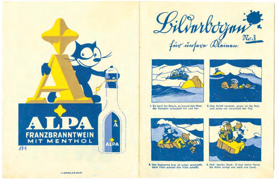 Ve stejnou dobu, kdy se Pepina Rejholcová představila na stránkách měsíčníku Mňam, začala v reklamních obrázkovoseriálových sešitcích vystupovat další zásadní postava vizuální populární kultury, a to dokonce té mezinárodní. Zatímco ve dvacátých letech svěřil kocouru Felixovi propagaci Hašlerek i František Lhotský (← II.1.10), v následující dekádě pak potenciálu slavného hrdiny kreslených grotesek využil rovněž brněnský podnikatel Josef Veselý, majitel „továrny lučebních a kosmetických přípravků“, která vyráběla především francovku Alpu. V roce 1932 si Veselý nechal u Obchodní a živnostenské komory v Brně zaregistrovat první sešit Obrázkových pohádek pro naše děti s Felixem v hlavní roli (Maňasová Hradská 2018: 85) a do roku 1938 těchto drobných reklamních dvojlistů (16 × 12 cm) vyšlo přinejmenším třináct, přičemž dvanáct jich mělo na titulu pořadové číslo. Letáky byly tištěny v modré a žluté, tedy Veselého firemních barvách, a první tři strany přeloženého letáku zabíral komentovaný seriál o šestnácti číslovaných panelech (→ P1). V rámci žánrové tradice je ve Felixových příbězích francovka Alpa představována jako zázračný elixír, který je vhodný jak k prevenci či léčbě nachlazení, tak i k posilujícím masážím svalů. Zároveň je patrné, že se tvůrci snažili co nejtěsněji držet vzhledu i povahy originálního Felixe (takže rovněž zde například opakovaně shání něco k snědku). Současně je však zřejmé i to, že je jim blízký způsob narace progresivních dobových „trikfilmů“ i komiksu, tudíž úsilí hrdinů vyjadřují odletující kapky, objekt jejich zájmu naznačuje přerušovaná čára mezi okem a vyhlédnutým předmětem, náraz zdůrazňují odletující hvězdičky, nápad dokládá vykřičník vznášející se nad hlavou protagonistů atd.