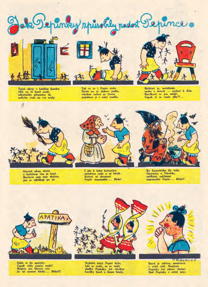kávy Perola, její výsledek ovšem představoval i šestnáctistránkový sešitek Jak Pepinu štěstí potkalo (13 × 10 cm) — komentovaný seriál složený z celostránkových kreseb vypráví o tom, jak Pepinu Rejholcovou navštíví její bohatá teta Anna, kterou tak okouzlí chuť žitné kávy, že za tento objev věnuje Pepině 500 Kč (→ P3). Na z ačátku války začal Voborský dosti těsně spolupracovat s pražskou společností Kadlec a synové, výrobcem mýdla Hellada a dalších mycích přípravků. V rámci propagace této firmy vyprodukoval minimálně čtyři reklamní obrázkovoseriálové sešitky (15,5 × 11,5 cm), v nichž s jednou výjimkou hrála hlavní roli Pepina Rejholcová (→ P3). Ve všech těchto tiskovinách pokrývaly každou stranu tři (ve výjimečných případech dva) panely, které byly provázeny čtyřveršími. V příběhu Pohádka o Pepině a čertu se o ruku hlavní hrdinky uchází zamilovaný pekelník tak dlouho, až ho Pepina nakonec vypere pracím práškem Šotek a zostuzený vybělený čert raději uteče