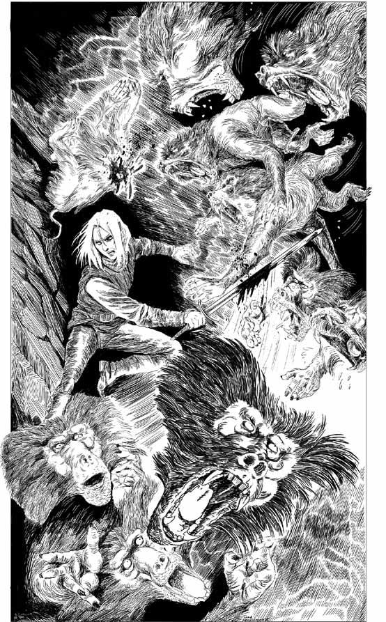 Ze tmy přisvištěl velký kámen a otřel se mu o vlasy. Za ním přiletěly další, některé zasáhly přesněji. Jeden z nich udeřil Geralta do hlavy a otřásl jím. Zatravci se na něho vrhli ze všech stran, divoce vyli a štěkali, škrábali a kousali. Nedalo se spočítat, kolik jich je, míhali se okolo něho příliš rychle. Geralt vytrhl z pochvy meč, jen aby o něho okamžitě přišel – dva zatravci ho znehybnili, třetí mu velkým kamenem vyrazil zbraň z ruky. Netvor zvedl ukořistěný meč, otevřel psí tlamu dokořán a vítězoslavně zařval. Jeho triumf byl předčasný – Geralt ze sebe oba útočníky setřásl, popadl kámen, mrštil jím a trefil monstrum rovnou do zubů. Zatravec upustil meč, Geralt skočil, popadl