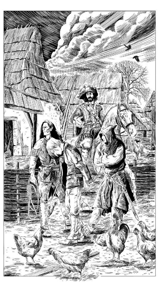 Na náves vjelo cvalem několik jezdců, zvířilo prach a vyplašilo slepice. Muži byli ozbrojeni, ale ustrojeni nejednotně, zato pestrobarevně, výstředně a poněkud vagabundsky. Pouze dva muži v čele byli upravenější. Velitel, kníratý muž v kamizole z losí kůže s pozlaceným bandalírem a v klobouku s pštrosím peřím. A dlouhovlasý elf s čelenkou v zeleném oděvu zvěda.