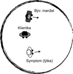 Po chvíli udělají jak Symptom, tak Bývalý manžel prakticky ve stejný okamžik krok dopředu. Tím se vytvoří kolem Klientky volný prostor. Klientka se ovšem ani nepohne, pouze si založí ruce před hrudí a trochu si odfrkne nosem.