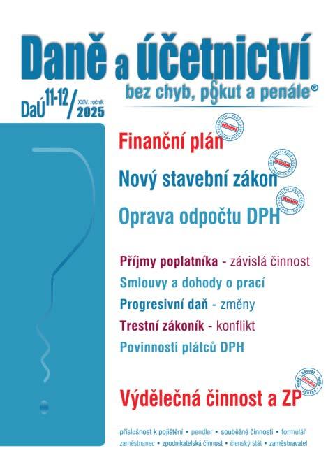 Nezapomněli jste si předplatit měsíčník DaÚ pro rok 2026? Kromě předplatitelských výhod čekají na Vás zajímavé informace o legislativních změnách. První číslo nového ročníku obdržíte již v listopadu a přečtete si o Finanční činností a DPH od 1. 1. 2026, Vrácení DPH fyzickým osobám při vývozu zboží, Zrušení srážkové daně u příjmů zahrnutých v § 6 odst. 4 ZDP...