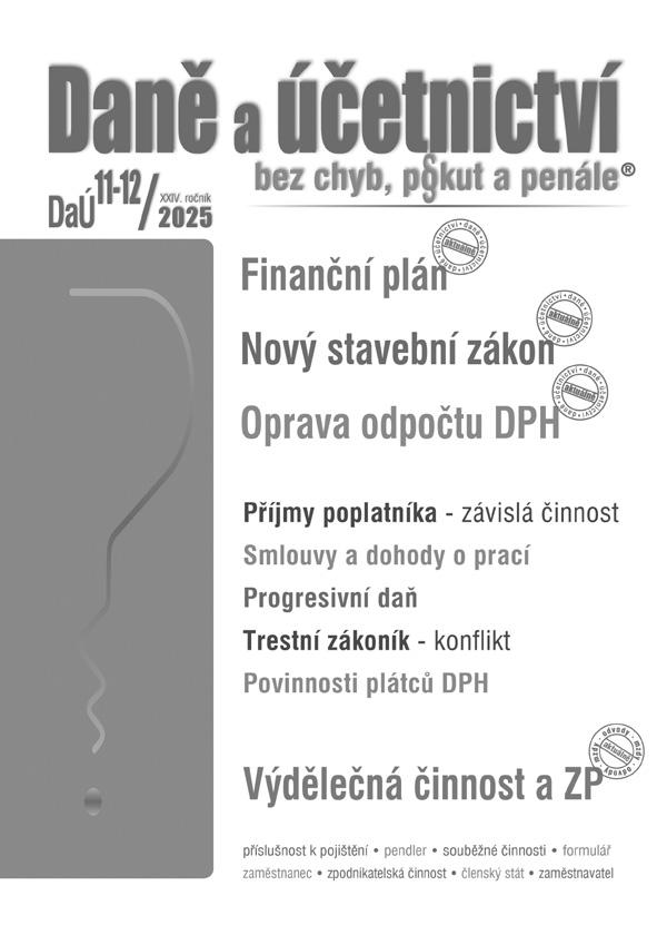 Jaká hlavní témata na Vás čekají v našich dalších měsíčnících? V Poradci 5/2026 je uveřejněn Zákon o zaměstnanosti po novele s komentářem, v DaÚ 11-12/2025 Pozor – platíte rozhlasové a televizní poplakty, v DÚVaP 11-12/2025 Nemocenské pojištění komplexně, Daňové řešení investování, v 1000 řešení 9-10/2025 praktické příklady k problematikám Kontrolní činnost zdravotních pojišťoven, Zápůjčka a úvěr.