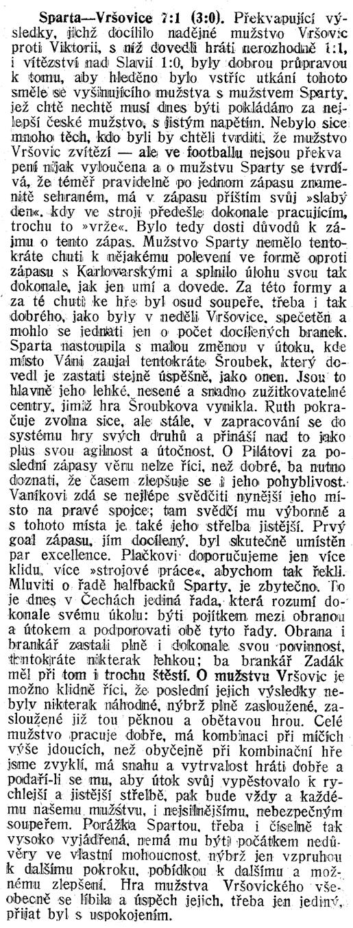 suchou, velice by se mýlil. Sport a hry kupříkladu napsal: Vršovičtí měli ukázati, zda výsledky jejich proti Slavii a Viktorii nebyly pouze dílem náhody. Nebyly. Vršovice sice poraženy značným počtem branek, ale hráči jejich vedli si tak, že hra jen působila opravdu dojmem mužstva prvotřídního. To budiž jim útěchou a zároveň pobídkou k další úsilovné práci, poctivému trainingu a pravému sportovnímu snažení. Konkurenční Sport uvedl neméně lichotivé hodnocení a superlativy ještě podtrhl snímkem poraženého mužstva na titulní straně!