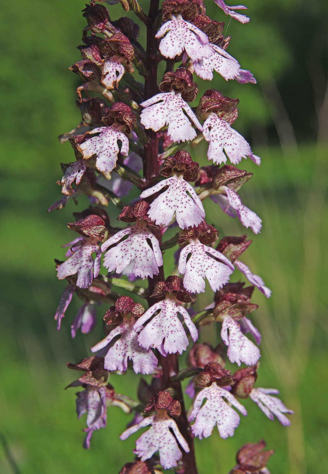 nachový (Orchis purpurea), který se dosti početně vyskytuje na "Bílých stráních" u Pokratic, je přílbovitým sblížením květních plátků podobný.