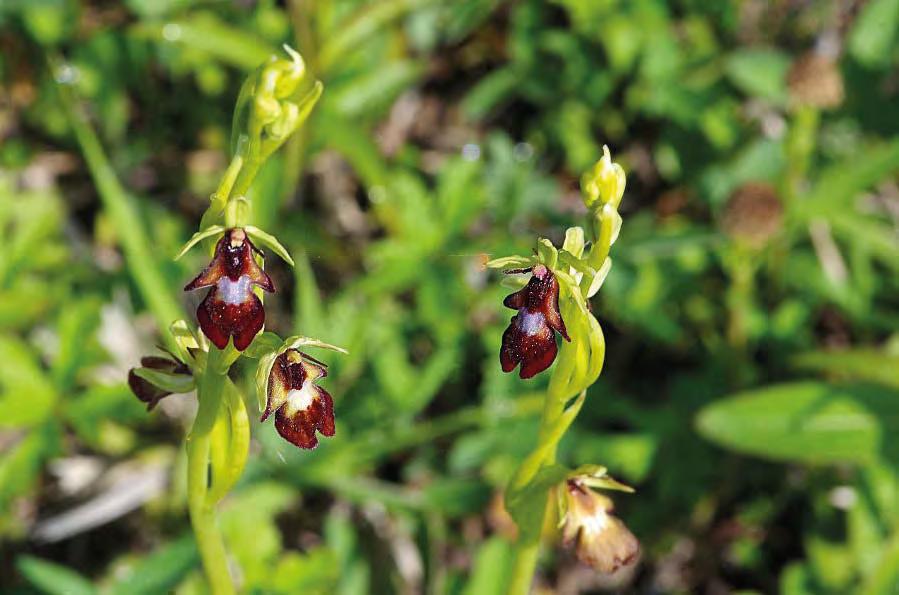 Opravdu pěkné, mohutné a květenou velice bohaté bílé stráně lze bez složitého hledání spatřit u Pokratic (součásti Litoměřic), protože jsou jako chráněné území „Bílé stráně“ zaneseny v turistických mapách. Z tamní květeny vybírám fotografie třemdavy bílé, hořce brvitého, a také atraktivních orchidejí. Tořič hmyzonosný je jednou z nich. Jeho zvláštní jméno souvisí se vzhledem květu a podivným způsobem opylování. Je to výsledek tzv. souběžného vývoje (paralelní evoluce), kdy živočišný a rostlinný druh sdílely společná místa výskytu tak dlouho, až jeden z nich tím byl ovlivněn a získal výhodu. U tořiče se vyvinuly květy poněkud podobné hmyzu, vydávající aromatickou látku lákající samečky vosilky mámené (Argogorytes mystaceus) Ti se marně pokoušejí o kopulaci, přičemž se na ně v ideální pozici uchytí pyl, nikoli práškovitý, ale spojený v mošničkovité brylky s lepkavými „držadélky“. Tořič tedy zotročuje specifického výkonného opylovače. Tořič je velice vzácnou orchidejí, ale vyskytuje se třebas i v řídkých světlých borech na opukách až vápnitých pískovcích na Úštěcku.2