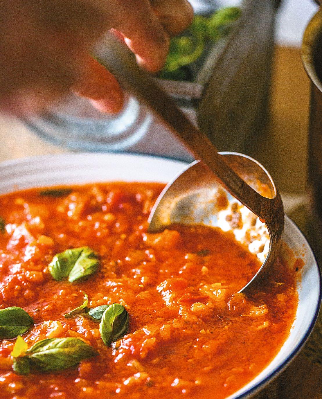 Její tajemství spočívá v pomalém vaření. Když v kuchyni pracujete s rajčaty, je třeba, aby se podle slov mé matky vydala ze své rajčatové chuti. Tím je myšleno, že se musejí pomalu vařit, aby se z nich vytratila kyselost a kovový nádech z konzervy a vynikla jejich sladkost. Kupte si ta nejlepší konzervovaná rajčata, jaká jsou ve vašem okolí k dostání (viz poznámka k rajčatům San Marzano, strana xviii).