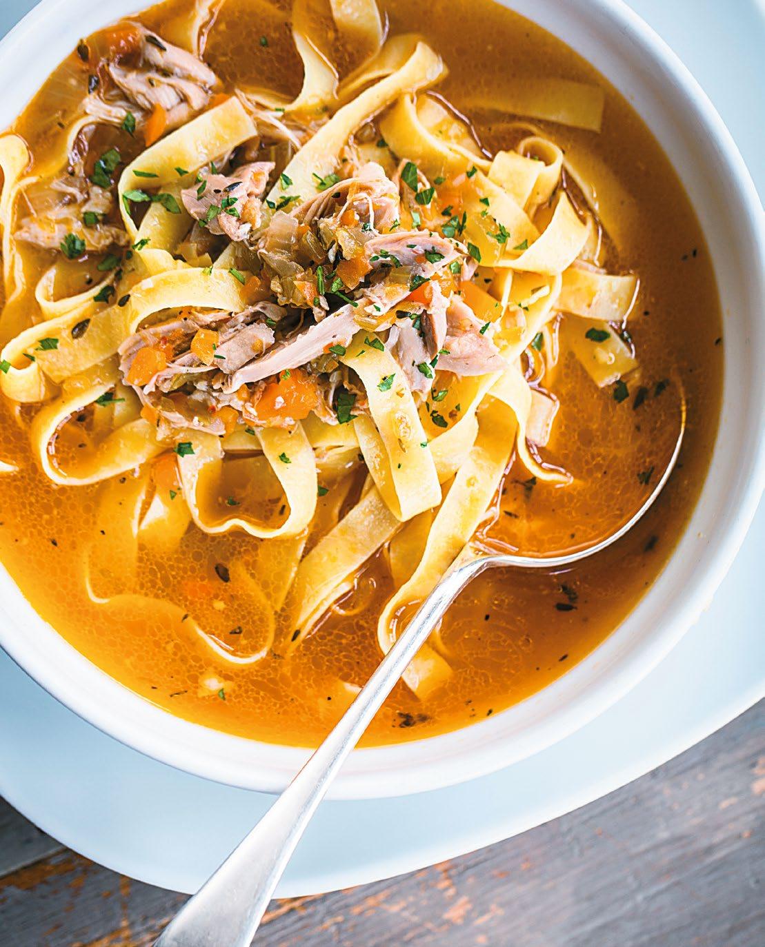 5. Z paliček odstraňte kůži a oberte maso, nakonec bude krásně měkoučké a v polévce se rozpadne na menší kousky. Vložte ho do polévky spolu s cibulí a šťávou z plechu. Podle chuti můžete přidat barbecue omáčku („Nevím, jak mě to vlastně napadlo – jednou jsem to prostě náhodou zkusila a polévce to dodalo na chuti,“ říká Emily.).