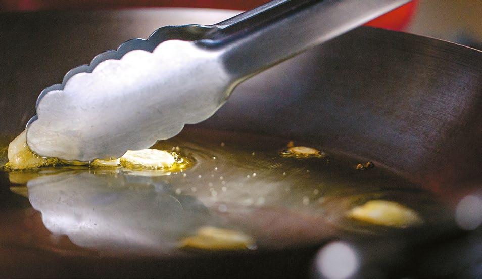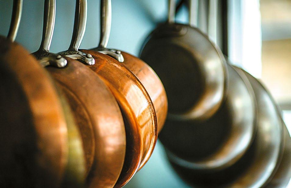 Dávám přednost kvalitním měděným nebo kovovým hrncům a pánvím se silným dnem. Za velmi užitečnou považuji také pořádnou litinovou pánev. Co se týče velikosti, chce to mít – jednoduše řečeno – hrnce a pánve malé, střední a velké. Navíc upotřebíte ještě velký hrnec na přípravu jednoho kilogramu těstovin či několika litrů vývaru, a také čtyřlitrový až pětilitrový litinový hrnec s poklicí. Pánve s nepřilnavým povrchem nemám zrovna v lásce.