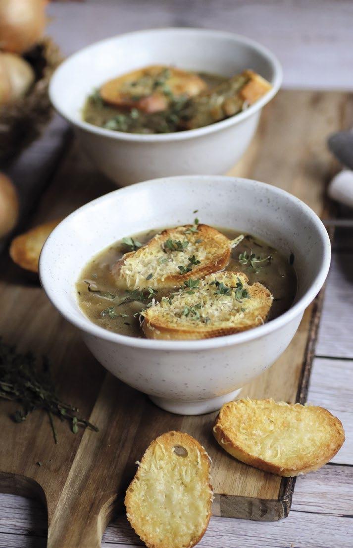 4 Cibulačku na talíři ozdobíme opečenými bagetkami, které lze zapéct s výraznějším francouzským sýrem.