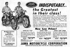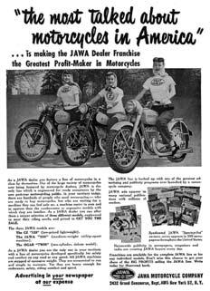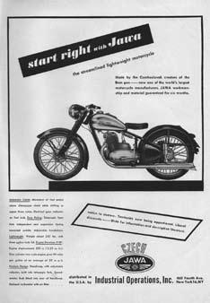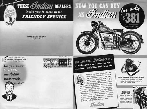 budované sítě prodejců. Obdobný kontrakt byl sjednán na prodej motocyklů prostřednictvím zavedené prodejní sítě firmy Indian Motorcycle Co. Ještě na konci roku 1946 bylo do USA odesláno několik prodejních vzorků nových typů motocyklů a pro Indian 400 kusová série motocyklů ČZ 125 A. Pravidelné dodávky motocyklů Jawa a ČZ započaly hned po Novém roce.