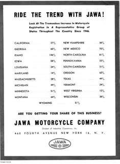 Firma Industrial Operations, Inc. začala již koncem roku 1947 budovat zcela novou prodejní síť prostřednictvím nově založené firmy Jawa Motorcycle co. Novým prodejcům slibovala masivní podporu prodeje uveřejňováním reklamy ve všech motoristických časopisech. V těchto reklamách nabízela ucelenou řadu motocyklů ČZ 125 a Jawa 250, k nimž přibyly i nové dvouválcové Jawy 350 typ 12, představované pod ochrannou známkou Ogar. V reklamě se též zavazovala k 48 hodinové garanci na dodání náhradních dílů. Zajímavostí v nabídce firmy byl i motocykl Jawa 250 typ 11 v úpravě pro autoškoly s dvojitým řízením.