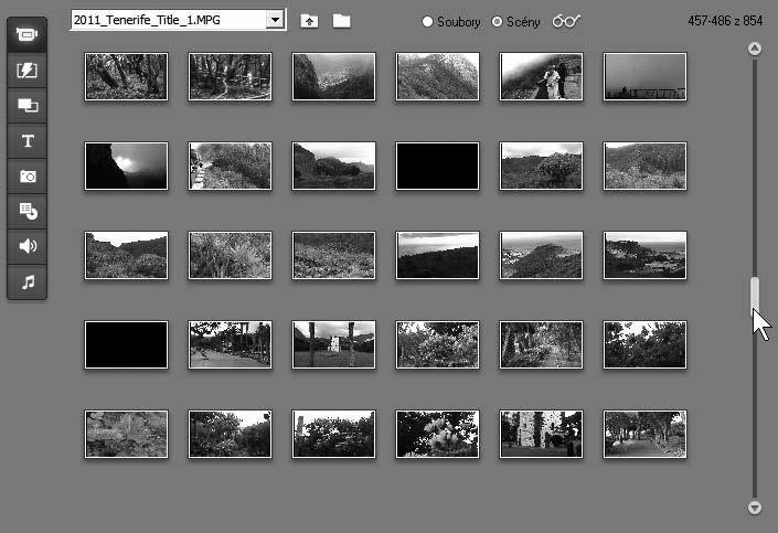 Vlevo nahoře se nachází Album – viz obrázek 1.1. Je to sklad všeho, co pro sestavení projektu potřebujete. Většinou se jednotlivé objekty (klipy) nabízejí ve formě náhledů. Je-li objektů více, je aktivní posuvník po pravé straně alba. Zdrojový soubor pro zobrazení vybíráte v rozevíracím seznamu v horní části alba; s ním jsou spojena tlačítka Posunout o úroveň výš a Vybrat jinou složku, jejichž pomocí zpřístupníte další složky na pevném disku počítače.