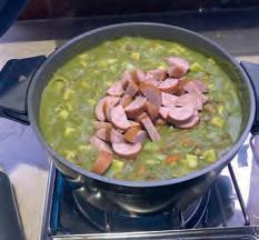 Na het pureren, alle groenten en de spekjes nog 10 minuten mee laten koken. Voeg ook de in stukjes gesneden rookworst toe.