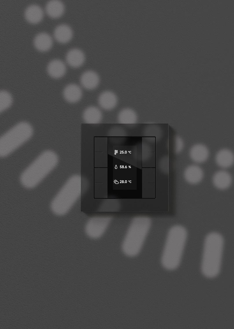 The Gira pushbutton sensor 4.55 Plus combines smart functions with compact design and offers up to eight freely configurable buttons, a backlit LCD display with clear function assignment for lighting, climate, scenes or shading, and integrated temperature and humidity sensors. Flexible planning and simple, intuitive control.