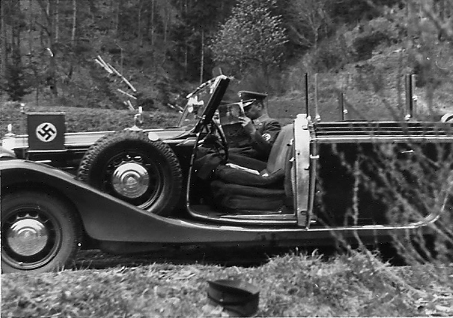 Viršuje: Alfredas Rosenbergas ilsisi savo oficialiame „Mercedes Tourenwagen“ automobilyje per pažintinę kelionę po Austriją kartu su Billu de Roppu 1938 metais. (© James de Ropp)