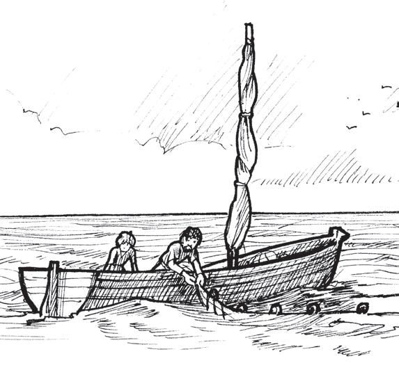 Žvejų valtis palengva sūpavosi ant bangų. Kalemas atrišo virvę ir nuleido burę. Tyliai šnopuodamas jo tėvas ėmė traukti tinklą.