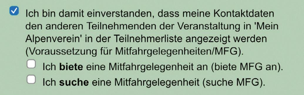 Anfang Juli wurde bei den Touren der Gruppen bei der OnlineAnmeldung ein neues Feld eingefügt, um eine Zustimmung zum Teilen der Kontaktdaten (Name, Telefonnummer, Email, Postleitzahl, Ort) einfach zu ermöglichen. Man kann darunter auch ankreuzen, ob man eine Mitfahrgelegenheit zu dieser Tour anbietet und/oder sucht.