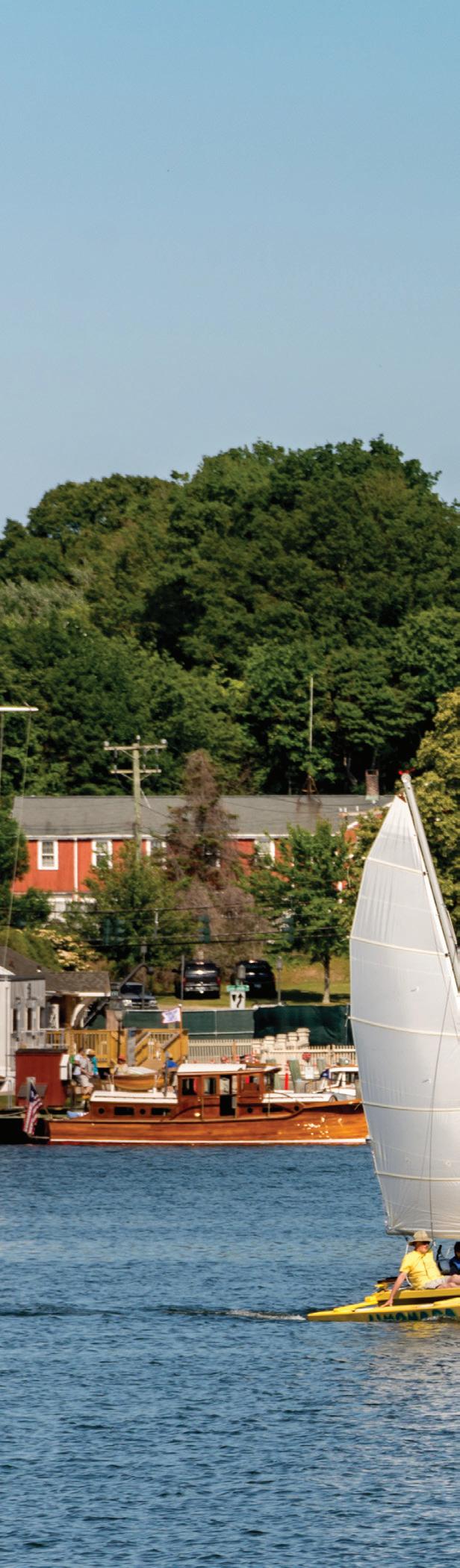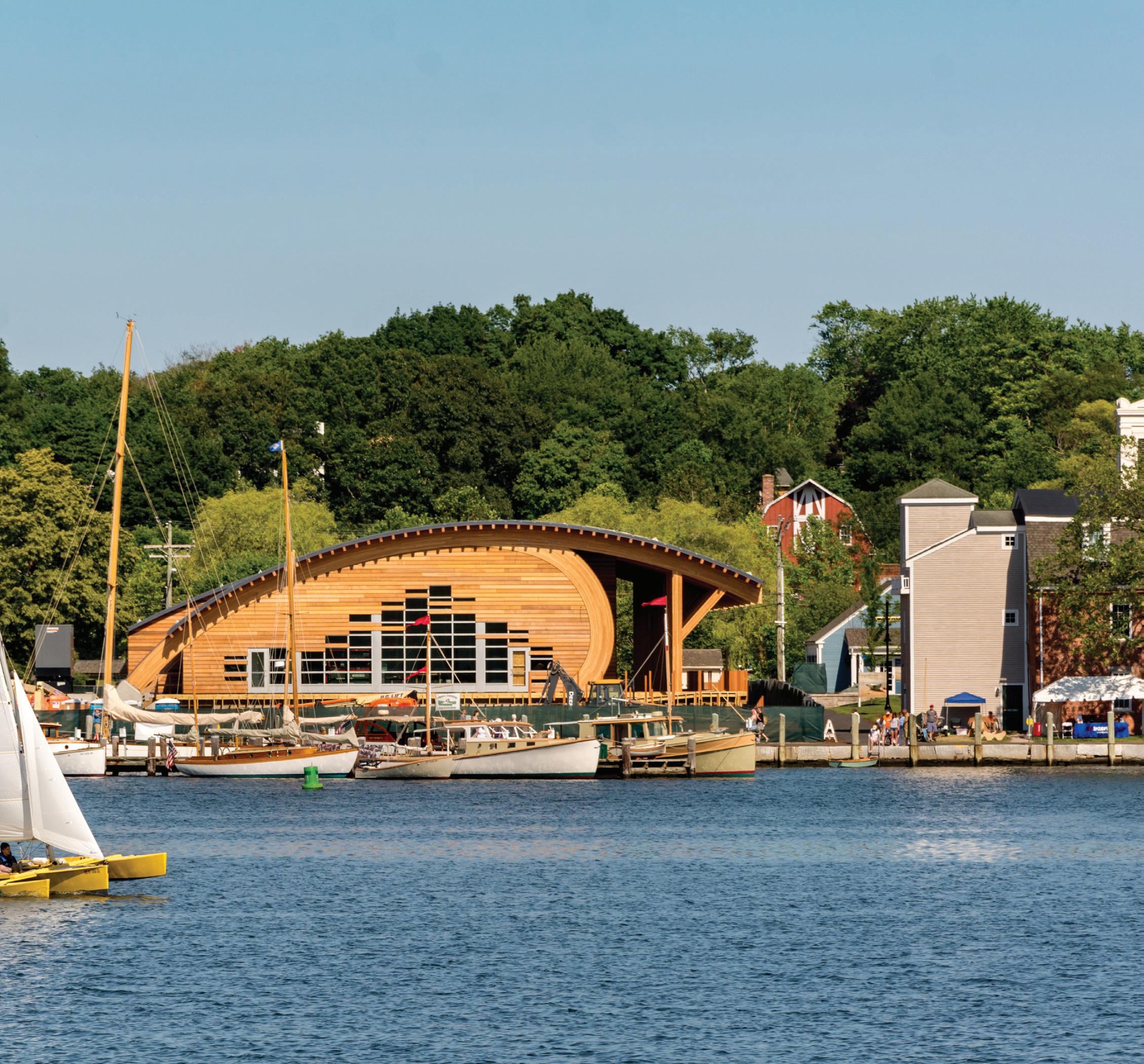 A legendary center of shipbuilding beginning in the 1600s, the area along the Mystic River has never changed course. Mystic Seaport continues to be a maritime destination, thanks in large part to the Museum of America and the Sea. The museum’s newest building is perhaps the most prominent structure on its 19-acre campus. The glass–and–wood design of the Thompson Exhibition Building, inspired by sailing vessels and the sea, features exposed timber frames and calls to mind the hull of an old sailing ship. Welcoming the seaport’s guests, the building serves as a visitor center, houses a gift shop, and affords the museum the versatile exhibition space it requires.