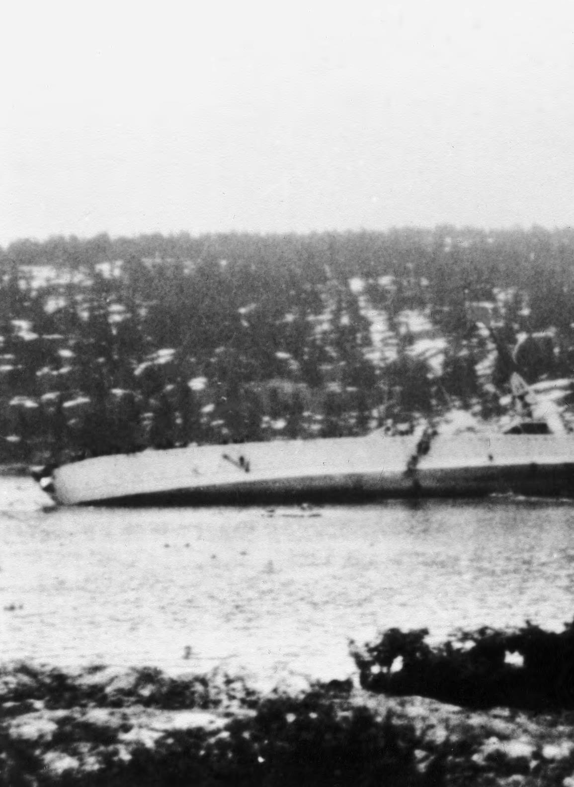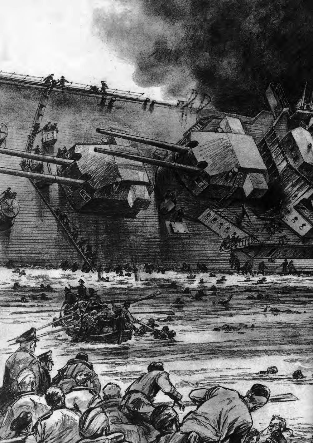 Richard realises that Helmut is gone. He has to think about himself. Determined, he swims towards the islets that are getting closer and closer. His hands are completely numb. There aren't many people around him now. Many have disappeared on the two to three hundred metre swim. He continues doggedly. As he takes a mouthful of water, he realises that there is a lot of oil in the sea. The glow of the fire on board is occasionally visible through the thick smoke. "Bloody hell! I've got to get into the islets before the oil ignites. Then there'll be hell to pay!" With the last of his strength, he makes his way to the northernmost islet. It is the largest of the four islets. It is already full of soldiers. Strong hands pull him up the last few metres.