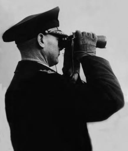 At 13:05, the heavy cruiser passes the Danish island of Anholt (15) in the Kattegat. It cuts through the sea at a steady, good speed, closely followed by the other vessels. Fritz and one of the other lighthouse keepers go on leave. A few hours of longawaited sleep lie ahead of them. Richard looks longingly at Fritz. His body language reveals that he is missing his hammock. At 5.15pm the group is level with the small island of Hirtsholm (16) off Fredrikshavn (17). They are approaching Skagen. The swells are getting heavier. Tension rises on board. They will soon be out in the open waters of the Skagerrak. The possibility of encountering British submarines increases. The heightened level of tension covers the entire vessel like a lid. Kapitän zur See Heinrich Woldag (18) stands on the bridge. The captain picks up a pair of binoculars and looks calmly out to sea. It's quiet up on the bridge. You can barely hear the monotone droning from machine. Suddenly the alarm goes off! From the bridge it is shouted: "Emden has hoisted