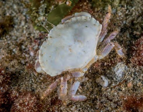 Duringasummerdive,youmaybeluckyenoughtowitness the fascinating crab hatching. The pregnant female crabs are often well hidden between kelp leaves and rocks. Beneath the tail flap there is an indeterminate, dirty grey ball with small eggs. This "egg ball" was shiny red during spawning,butafterthefemalecrabhascarriedthe fertilized eggs under the tail flap for seven to eight months, the nutrients in the yolk are almost completely used up. Throughthe transparent eggshell, a pairofeyes and thehint of a shell are all that is visible of a living larva. These tiny larvae have reached the stage where they have to leave the safe existence well protected inside the egg under the wide tail flap. When the time is right, the female crab swings the tail flap back and forth. With powerful and rhythmic movements, clouds of tiny living creatures are dispersed into the water.