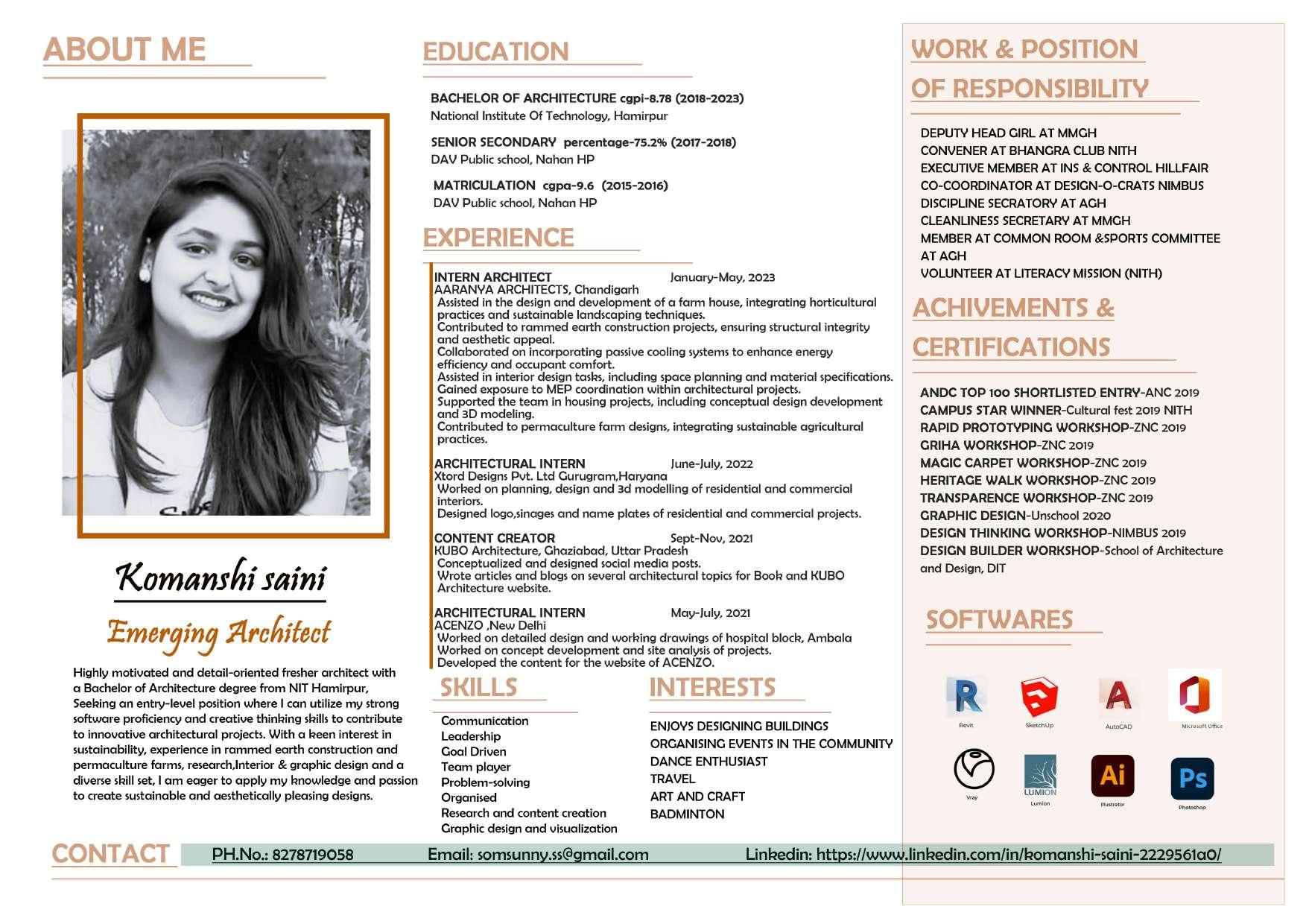 Hello! I am Komanshi Saini, a Final Year student of Bachelor of Architecture at the National Institute of Technology Hamirpur. Here is my Architectural portfolio. This portfolio is a summarization of my academic and professional work from the year 2018-2022.