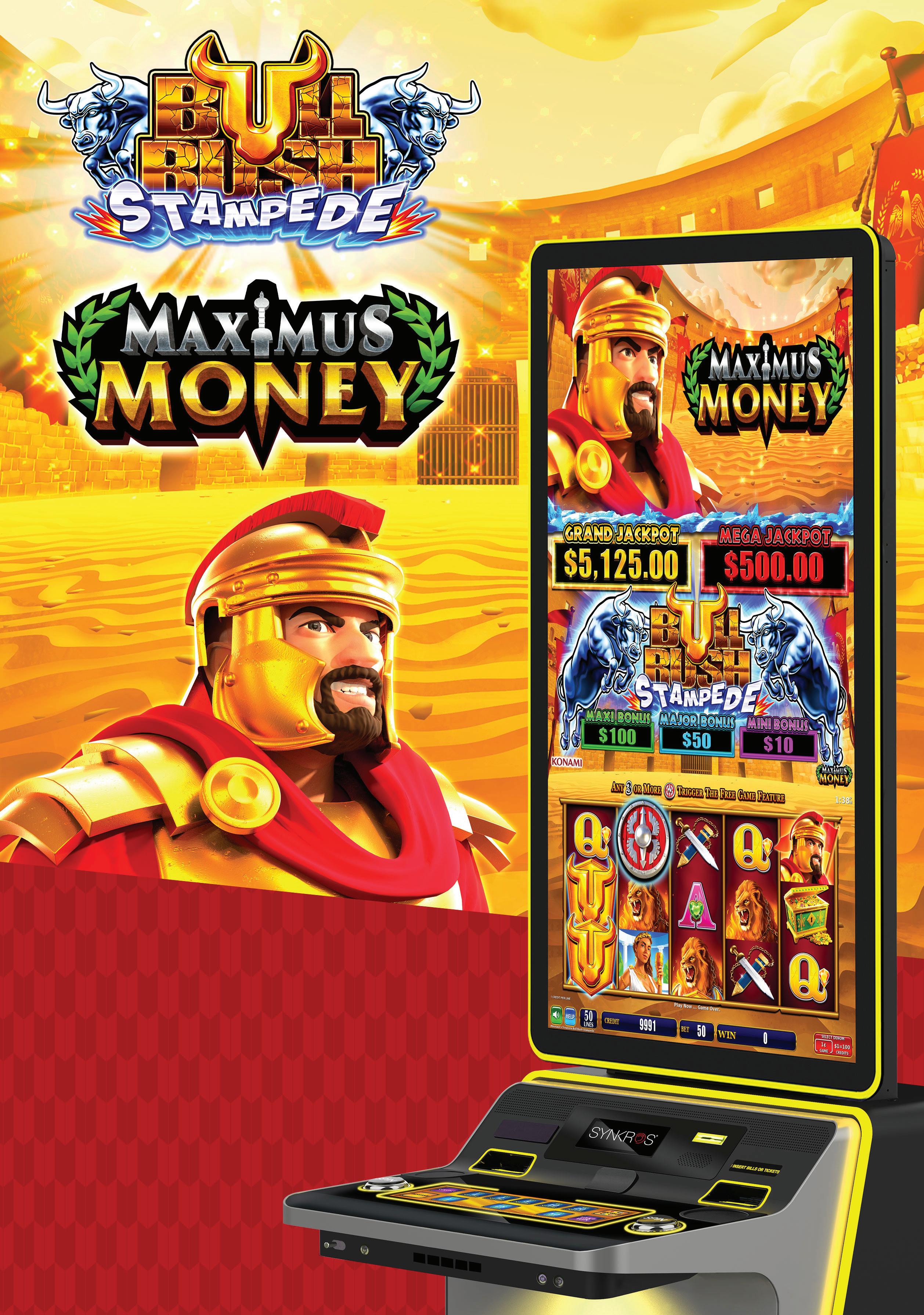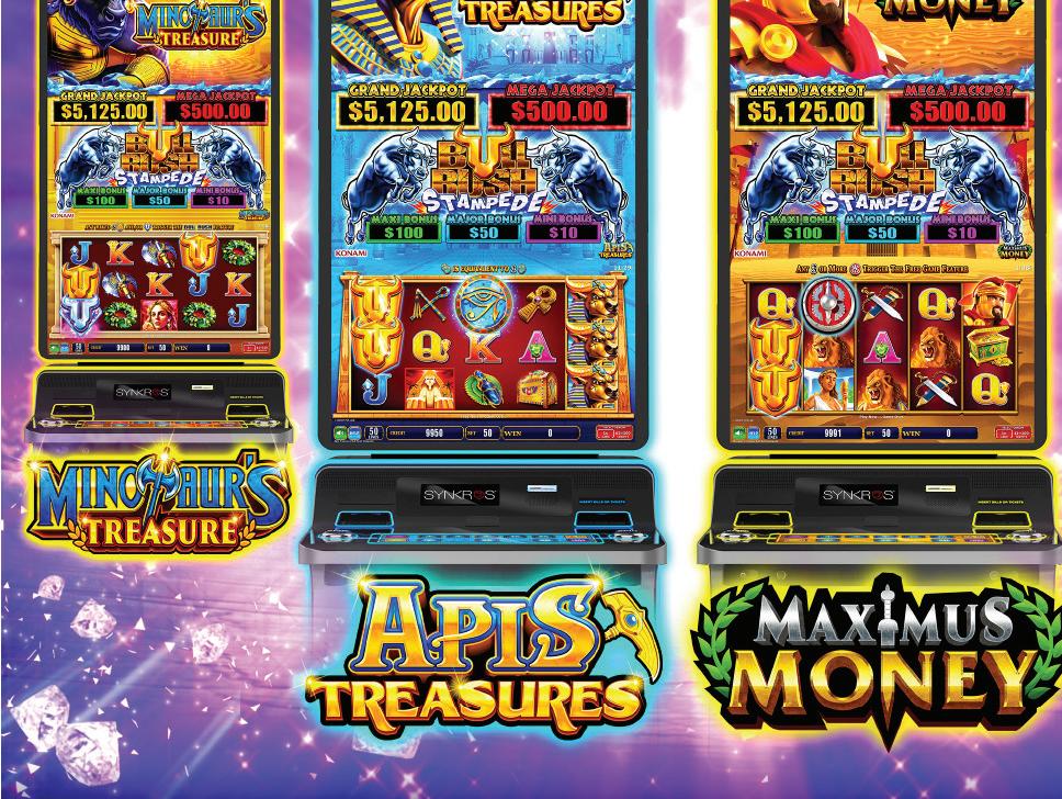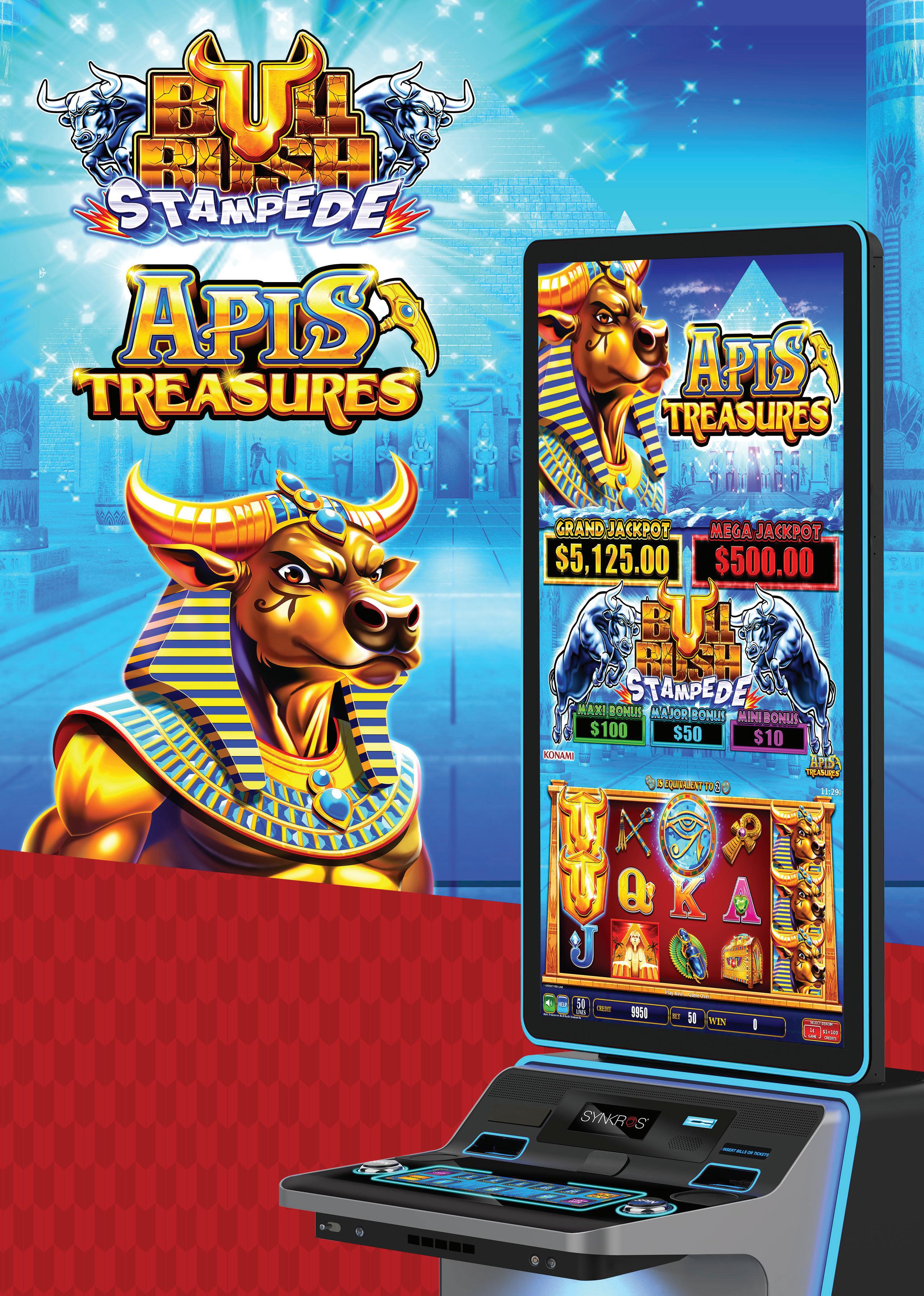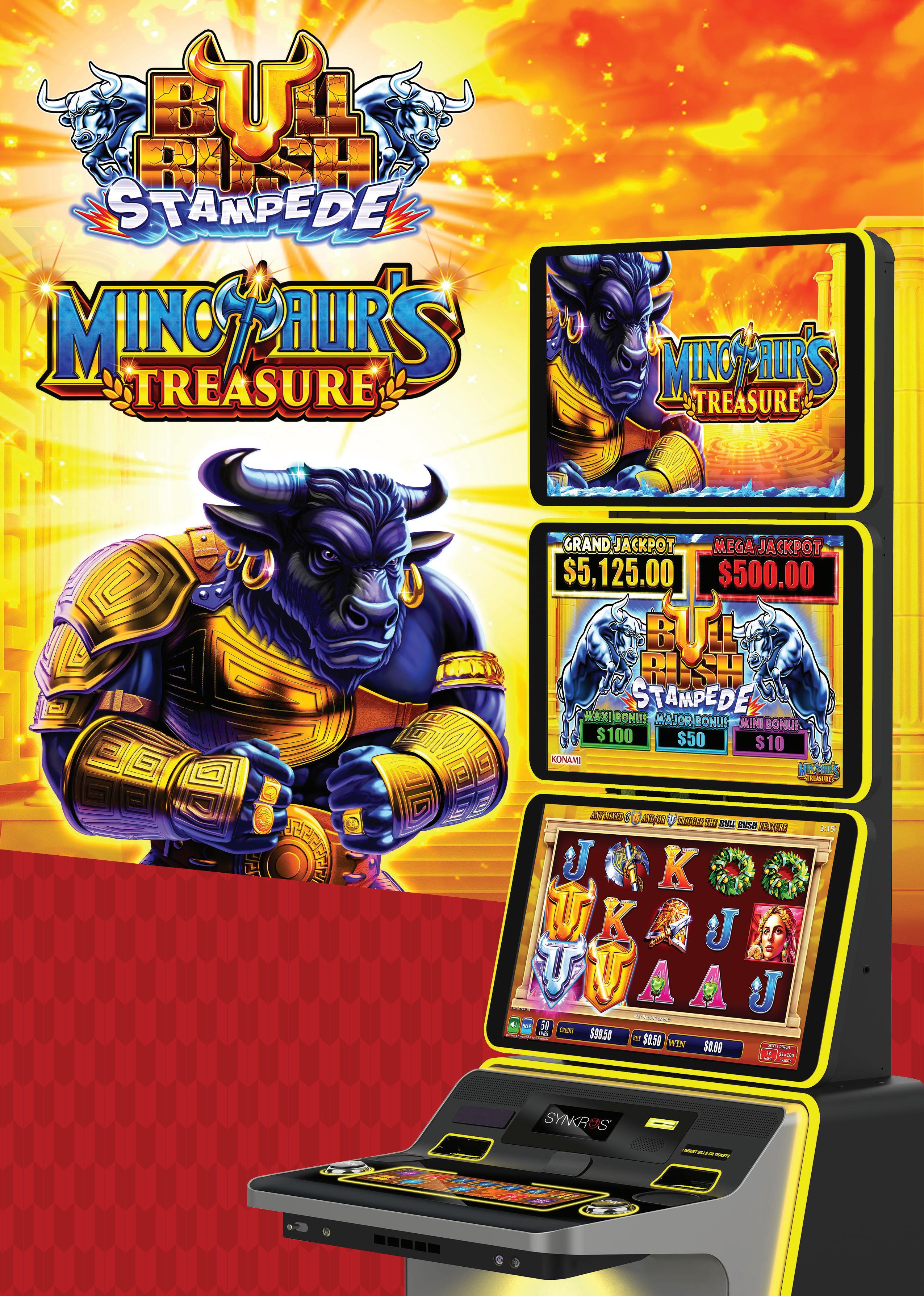 Bull Rush Stampede has been one of the biggest hits for both Konami and the market over the past twelve months, with Minotaurās Treasure and Fire Mountain igniting gaming ļ¬oors across the country. With such great results we have committed to two more titles in this series with game three Apis Treasure and game four combining the best Bull Rush game Maximus Money with the Stampede series.