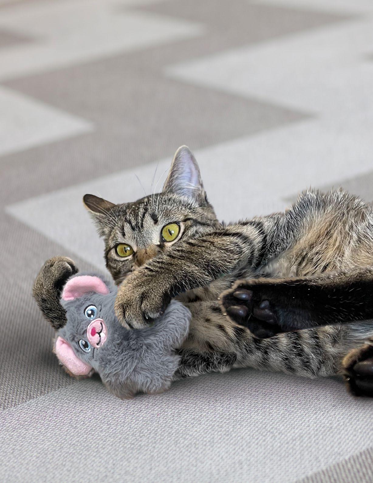 Plump mouse for batting, wrestling, and snuggling Inner crackle adds excitement