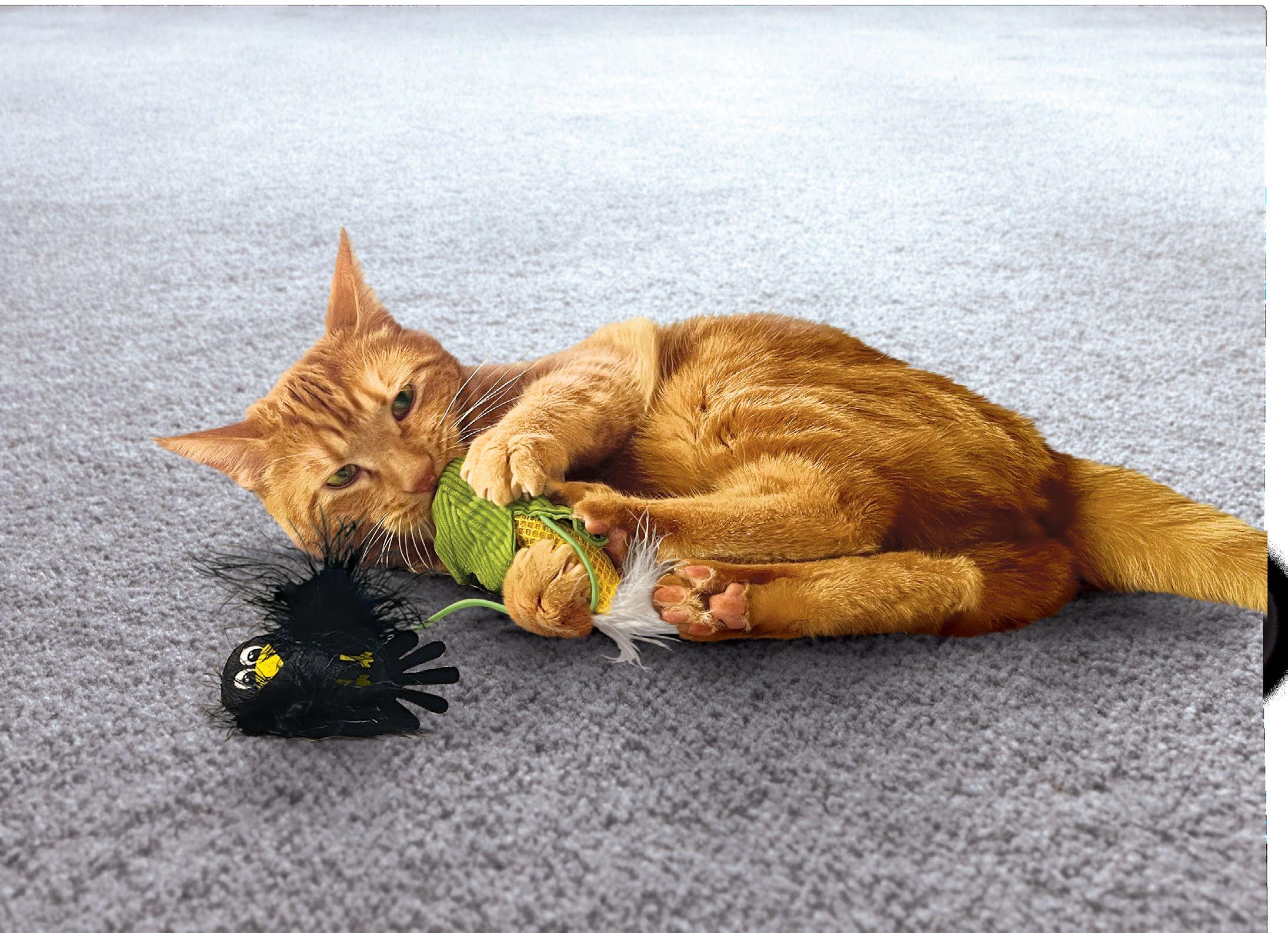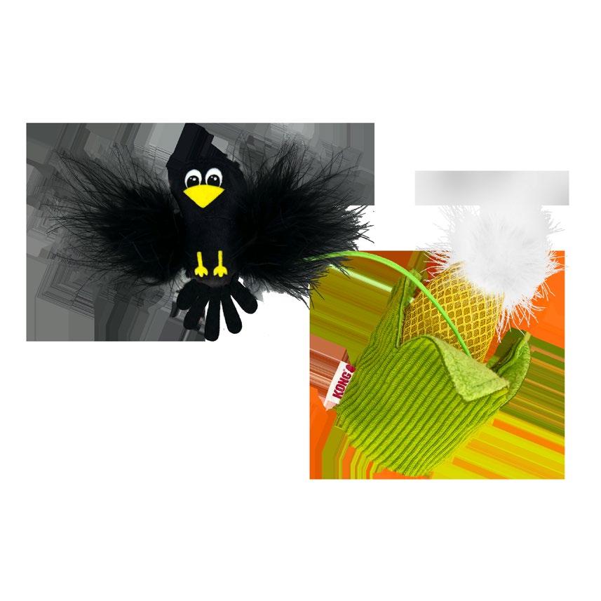 KONG Flingeroo Corny has a unique shape designed to spark cats’ instincts, for healthy, full-body play. An elastic tether gives this crow and corn cob bounceback and flinging movements for active play sessions including capturing, swatting, biting, and scratching. The plush crow has real feather wings creating an enticing fluttering motion, while the corn is made of crackling mesh and corduroy textures, topped with another feather to tease cats’ tactile senses. This crow has found a good home nestled inside the corn cob, so it’s your cat’s job to get it out! KONG Premium North American Catnip inside extends playtime.