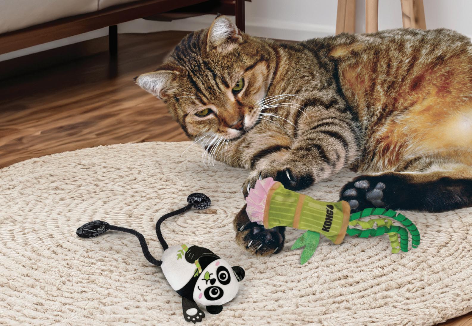 • Des jouets imprégnés d’un parfum débordant d’herbe à chats véritable, ce qui incite à un jeu dynamique